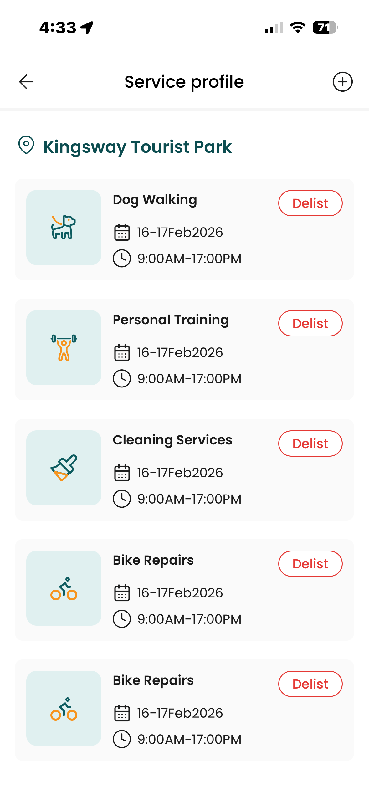 Your service becomes visible when you are checked in at a location.