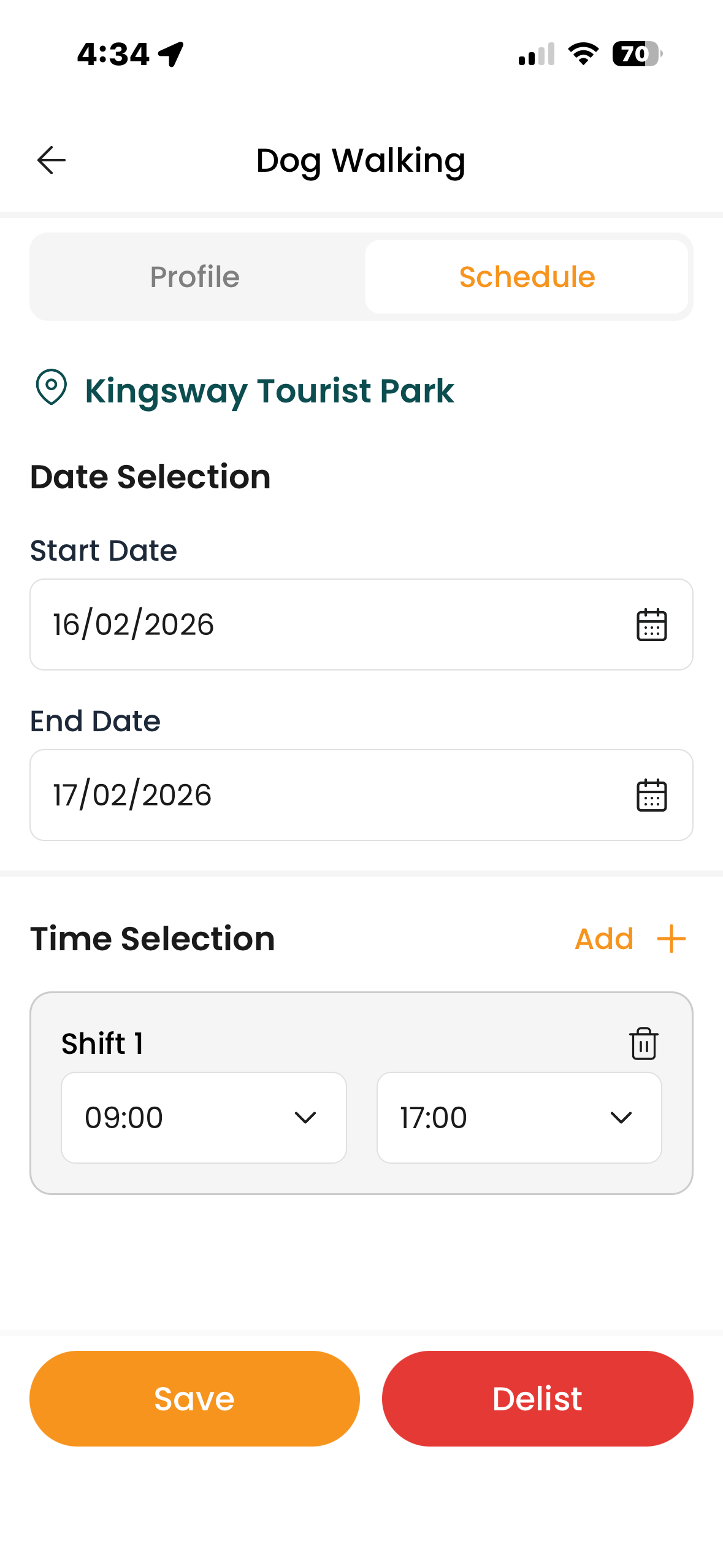 Profile → Service Management → Service Profile → Select Service → Schedule