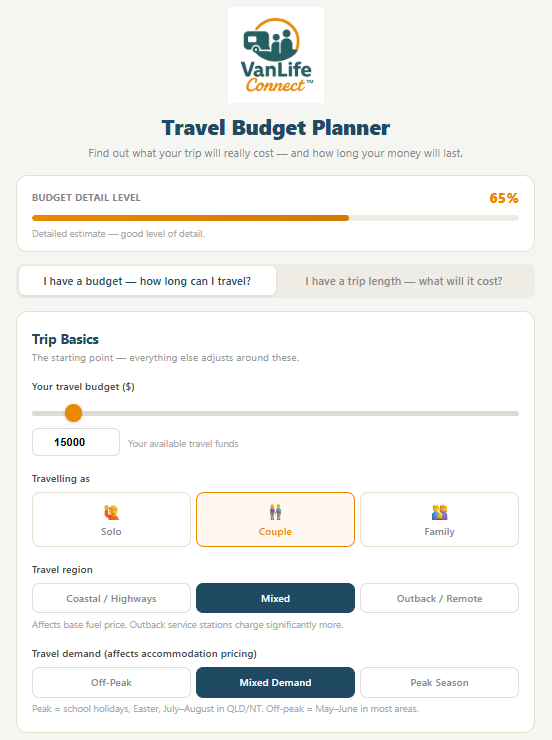 This planner helps you estimate your real travel costs across fuel, camps, food, and more based on how Australians actually travel the country. Whether you are planning your first trip or refining your setup, it gives you a clear, practical view of what life on the road will cost.